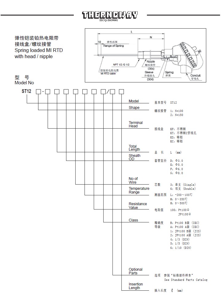 ST12弹性铠装铂热电阻带接线盒/螺纹接管