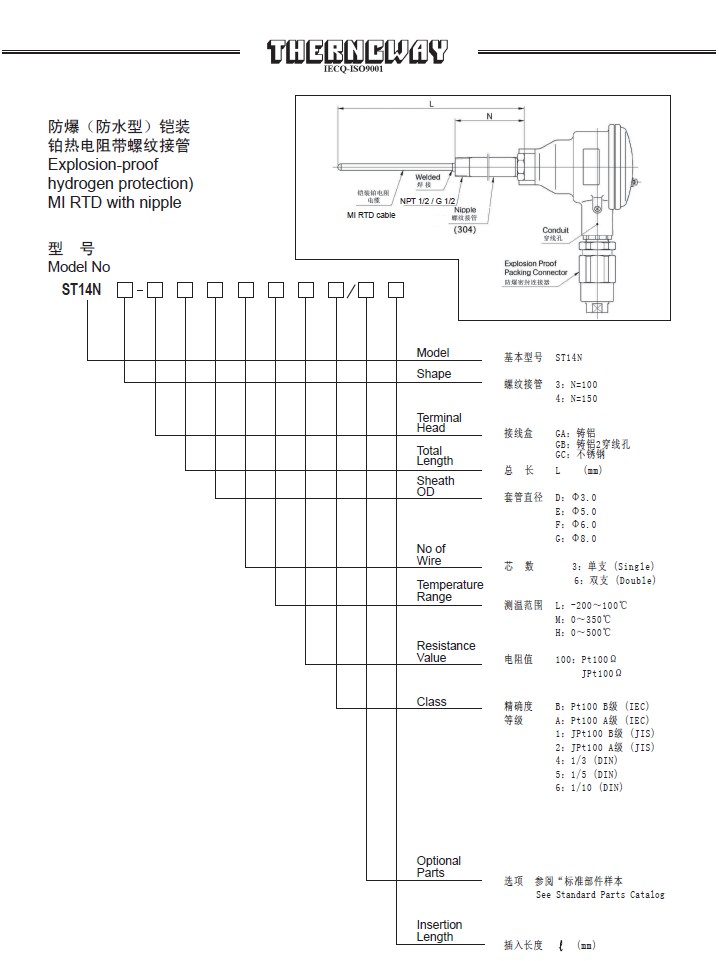 ST14N防爆(防水型)铠装热电阻带螺纹接管