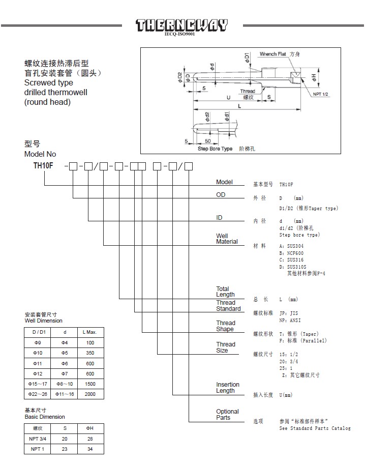 TH10F螺纹连接热滞后型盲孔安装套管(圆头)